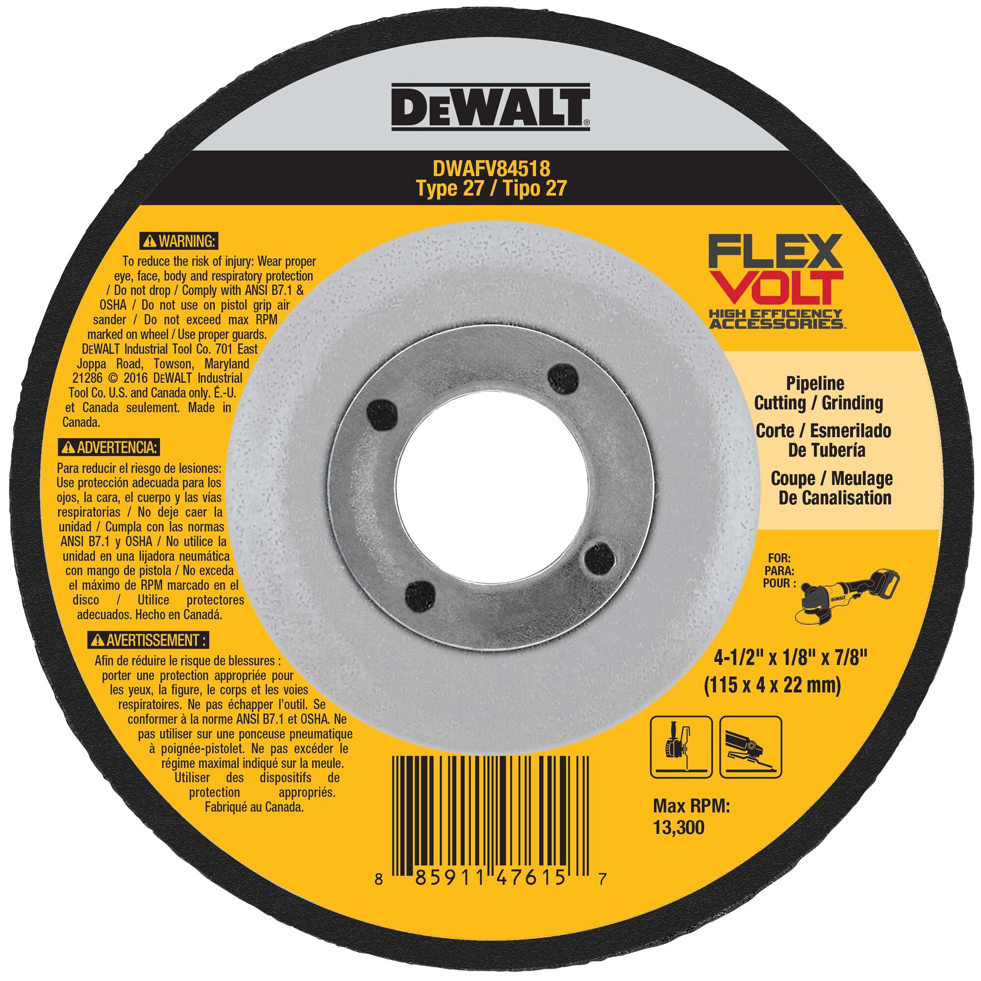 DEWALT Flexvolt grinding wheel is engineered to maximize runtime with High Density Grain Concentration for fast grinding and low heat build up